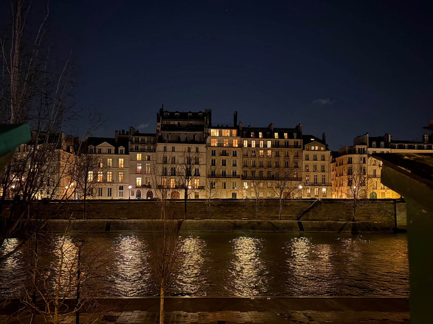 An evening walk along the Seine in Paris. The moon illuminated the sky, highlighting the clouds that softly blew along with me, and the inviting glow from apartment windows reflected on the river. The repetitive ripples in the water were mesmerizing, almost hypnotic. I felt as if I were in some sort of lucid dream.